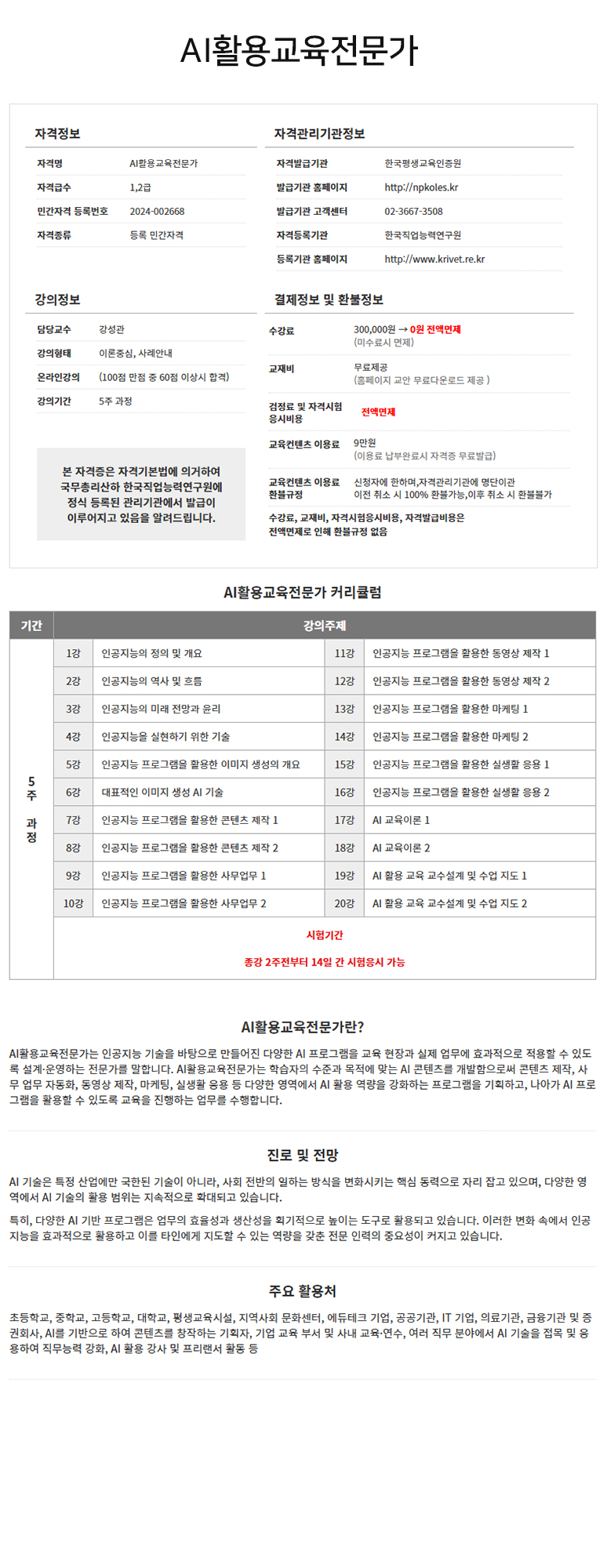 ¤ý¼ö°·á : ¤ý±³Àçºñ : ¹«·áÁ¦°ø(±³¾È ¹«·á´Ù¿î·Îµå Á¦°øÀ¸·Î ÀÎÇÑ È¯ºÒ±ÔÁ¤ ¾øÀ½) ¤ý°ËÁ¤·á ¹× ÀڰݽÃÇè ÀÀ½Ãºñ¿ë : Àü¾×¸éÁ¦(Àü¾×¸éÁ¦·Î ÀÎÇÑ È¯ºÒ±ÔÁ¤ ¾øÀ½) ¤ý±³À°ÄÁÅÙÃ÷ÀÌ¿ë·á : 9¸¸¿ø(ÀÌ¿ë·á ³³ºÎ¿Ï·á½Ã ÀÚ°ÝÁõ¹«·á¹ß±Þ) ¤ý±³À°ÄÁÅÙÃ÷ ÀÌ¿ë·á ȯºÒ±ÔÁ¤ : ½ÅûÀÚ¿¡ ÇÑÇϸç, Àڰݰü¸®±â°ü¿¡ ¸í´ÜÀ̰ü ÀÌÀü Ãë¼Ò ½Ã 100% ȯºÒ°¡´É, ÀÌÈÄ Ãë¼Ò ÀÌÈÄ Ãë¼Ò ¶Ç´Â °³ÀÎÀڰݹøÈ£¸¦ º»ÀÎÈ®ÀÎÇÑ ÈÄ È¯ºÒºÒ°¡ |